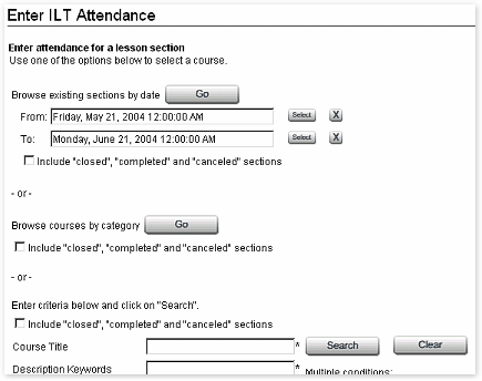 You can browse existing sections for all ILT courses by entering a range of dates and pressing "Go." See To use Select Date calendars in the "General Information and Procedures" section for information on entering dates.